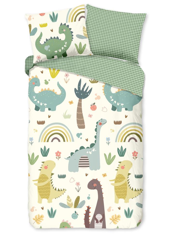 Kinderdekbedovertrek Quint van Good Morning in de kleur groen, met een print van vrolijke dino's. Het dekbedovertrek is gemaakt van 100% katoen. Deze kwaliteit is ademend, vochtabsorberend en voelt zacht en soepel aan. Dit leuke kinderdekbedovertrek is een leuke toevoeging aan iedere kinderkamer. Het kinderdekbedovertrek is geschikt voor ieder jaargetijde. Het katoenen 100% katoen is heerlijk koel in de zomer en geeft warmte in de winter. De set bestaat uit 1 kinderdekbedovertrek in de maat 140x220 cm inclusief één kussensloop van 60x70 cm met hotelsluiting. Het kinderdekbedovertrek is voorzien van een dubbele doorlopende instopstrook van 20 cm, waardoor de totale lengte circa 240 cm bedraagt. Hierdoor is het kinderdekbedovertrek geschikt voor dekbedden met een lengte van 200 tot 220 cm. Dit item is Oeko-Tex gecertificeerd (Oeko-Tex Standard 100): vrij van schadelijke stoffen en huidvriendelijk. Wasbaar op max. 40°C en geschikt voor de wasdroger.