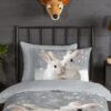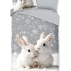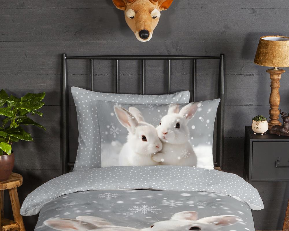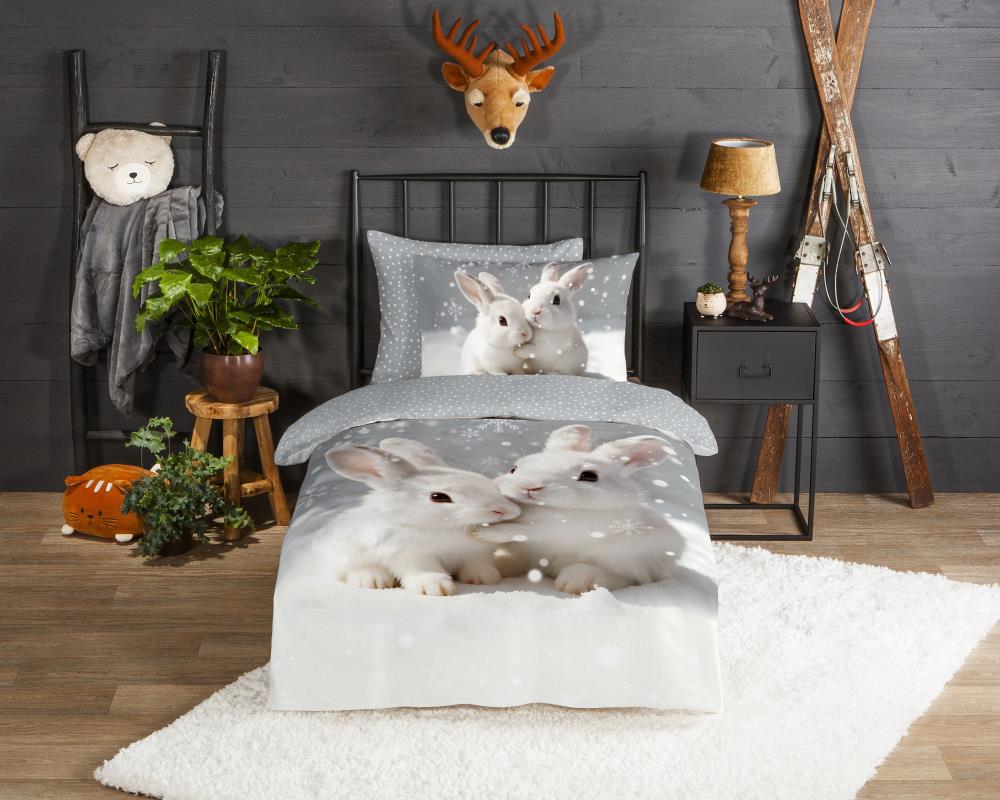 Flanellen kinderdekbedovertrek Coef van Good Morning, in de kleur grijs, met een print van een Witte konijnen in de sneeuw. Het dekbedovertrek is gemaakt van 100% katoen/flanel dat licht is geruwd, waardoor een fluweeelzacht laagje ontstaat dat heerlijk warm aanvoelt -perfect voor koude nachten. Deze warme, comfortabele stof is ademend en vochtabsorberend. Dit leuke kinderdekbedovertrek is een toevoeging aan iedere kinderkamer. Flanellen kinderdekbedovertrek zijn bij uitstek geschikt voor de koude wintermaanden. De set bestaat uit 1 kinderdekbedovertrek in de maat 140x200/220 cm inclusief één kussensloop van 60x70 cm met hotelsluiting. Het kinderdekbedovertrek is voorzien van een dubbele doorlopende instopstrook van 20 cm, waardoor de totale lengte circa 240 cm bedraagt. Hierdoor is het kinderdekbedovertrek geschikt voor dekbedden met een lengte van 200 tot 220 cm. Dit item is Oeko-Tex gecertificeerd (Oeko-Tex Standard 100): vrij van schadelijke stoffen en huidvriendelijk. Wasbaar op max. 40°C en geschikt voor de wasdroger.