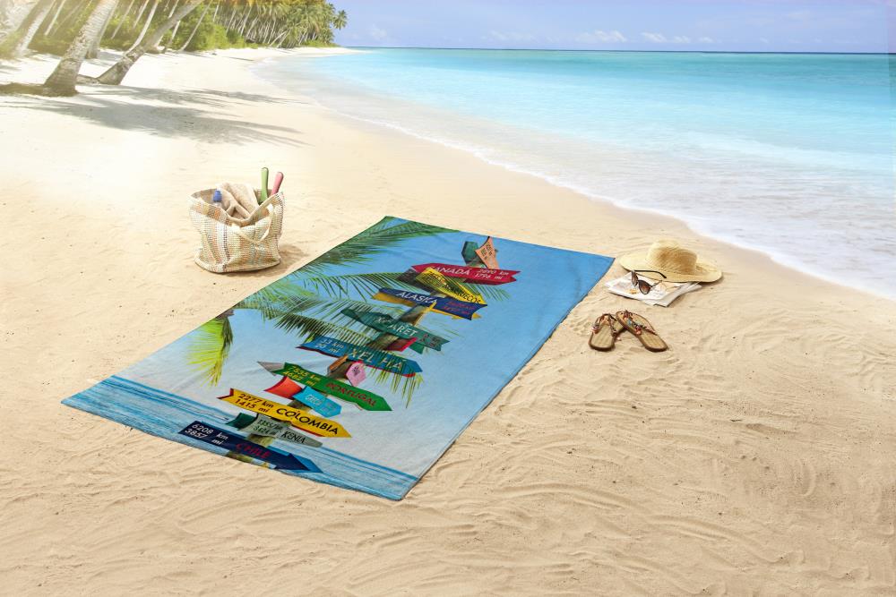 Strandlaken Beach Sign van Good Morning. Dit strandlaken met strand wegwijzers, in de kleur multi, is een echte eyecatcher. Strandlakens van Good Morning hebben altijd een leuke en vrolijke print.