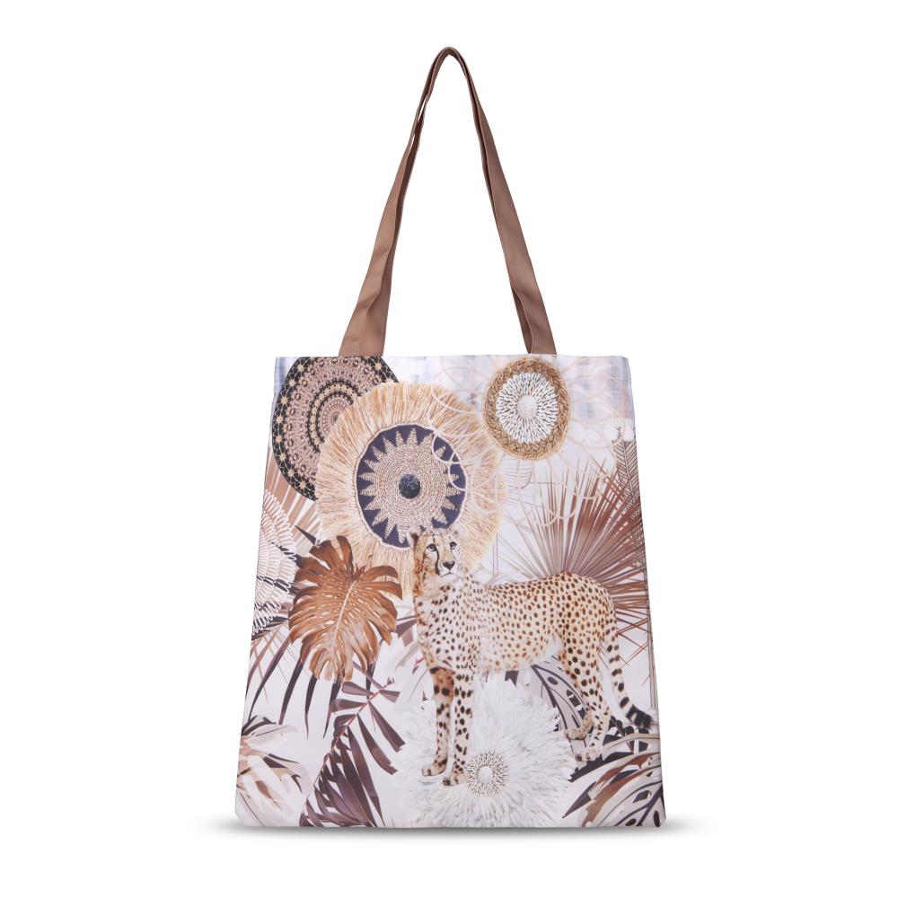 Opvouwbare boodschappentas raeni van HIP. Deze tas met mandala's en een luipaard in de kleur taupe is een shopper die direct opvalt. Alle boodschappentassen van HIP zijn vrolijk gekleurd en hebben een mandala-print.